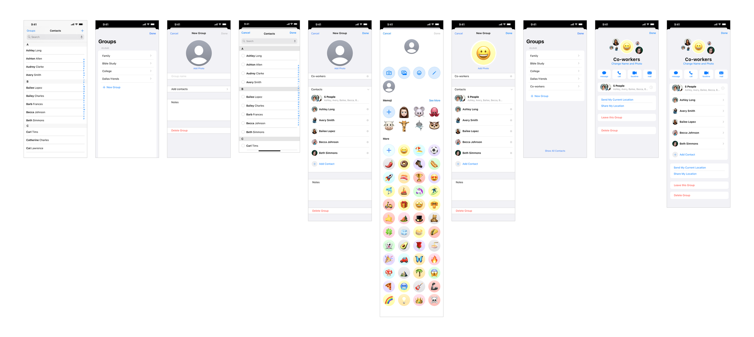 With my task flow and Apple’s existing Contacts App layout in mind, I created wireframes to outline the process and initial design ideas. Apple’s products have a distinct and recognizable interface, so my design followed the existing design to create a clean and cohesive feature to this product.