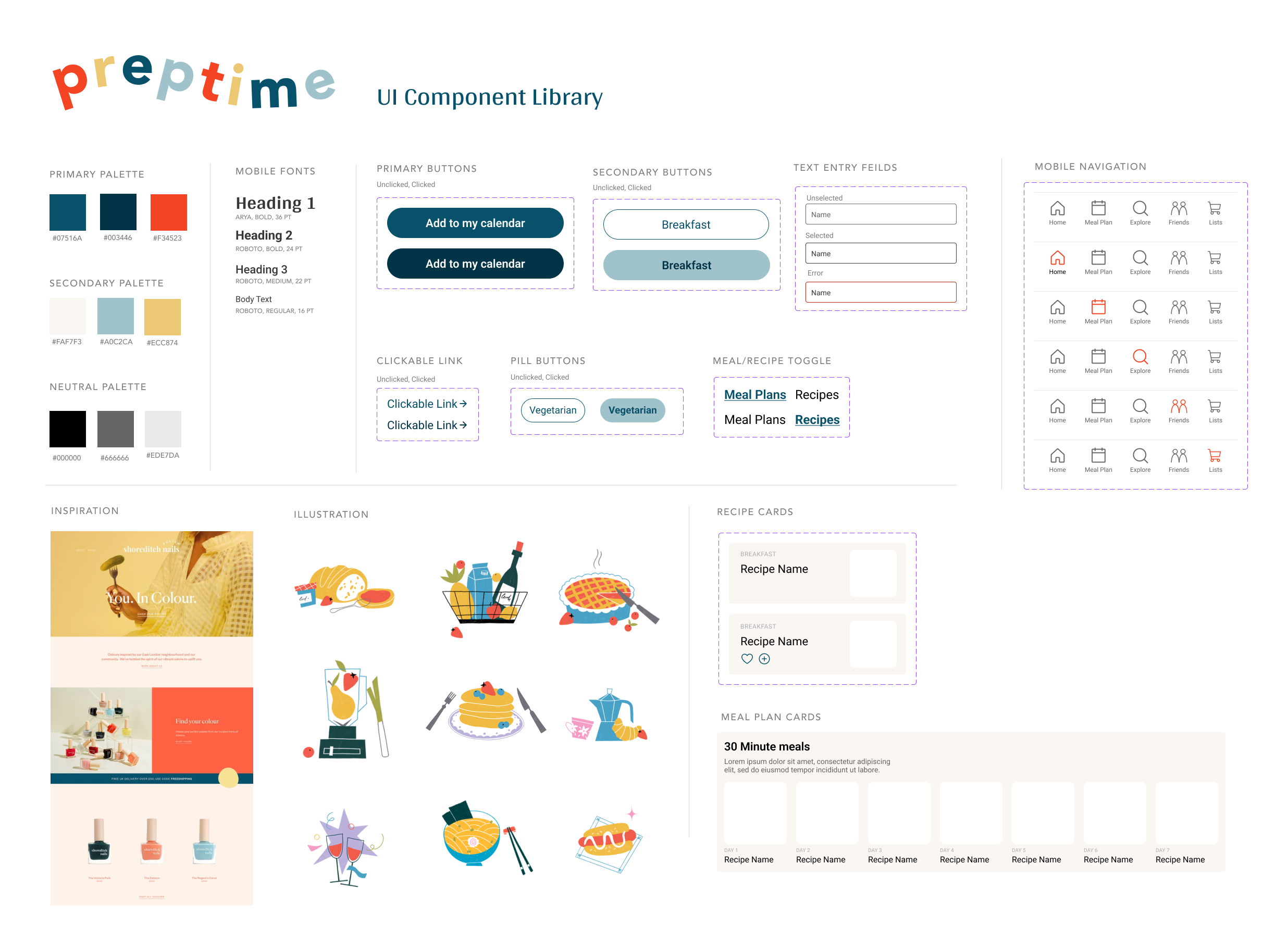 With these additions in place, I moved on to branding to develop high-fidelity wireframes. I chose the name Preptime and created a style guide inspired by retro 1950s and 60s cooking.