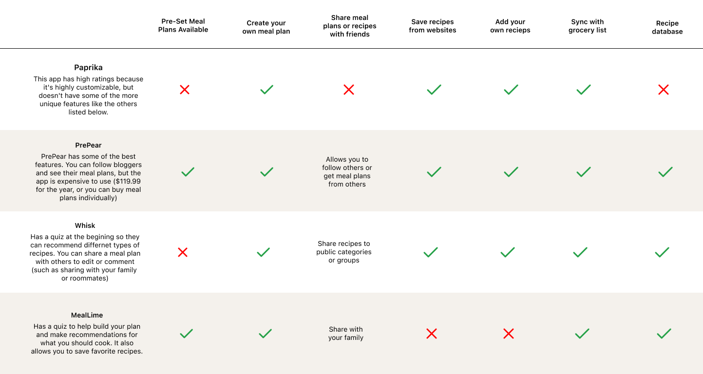 There is a wide variety of meal planning apps with many different features, so I began by comparing some of the top meal planning apps to see what features make them unique.