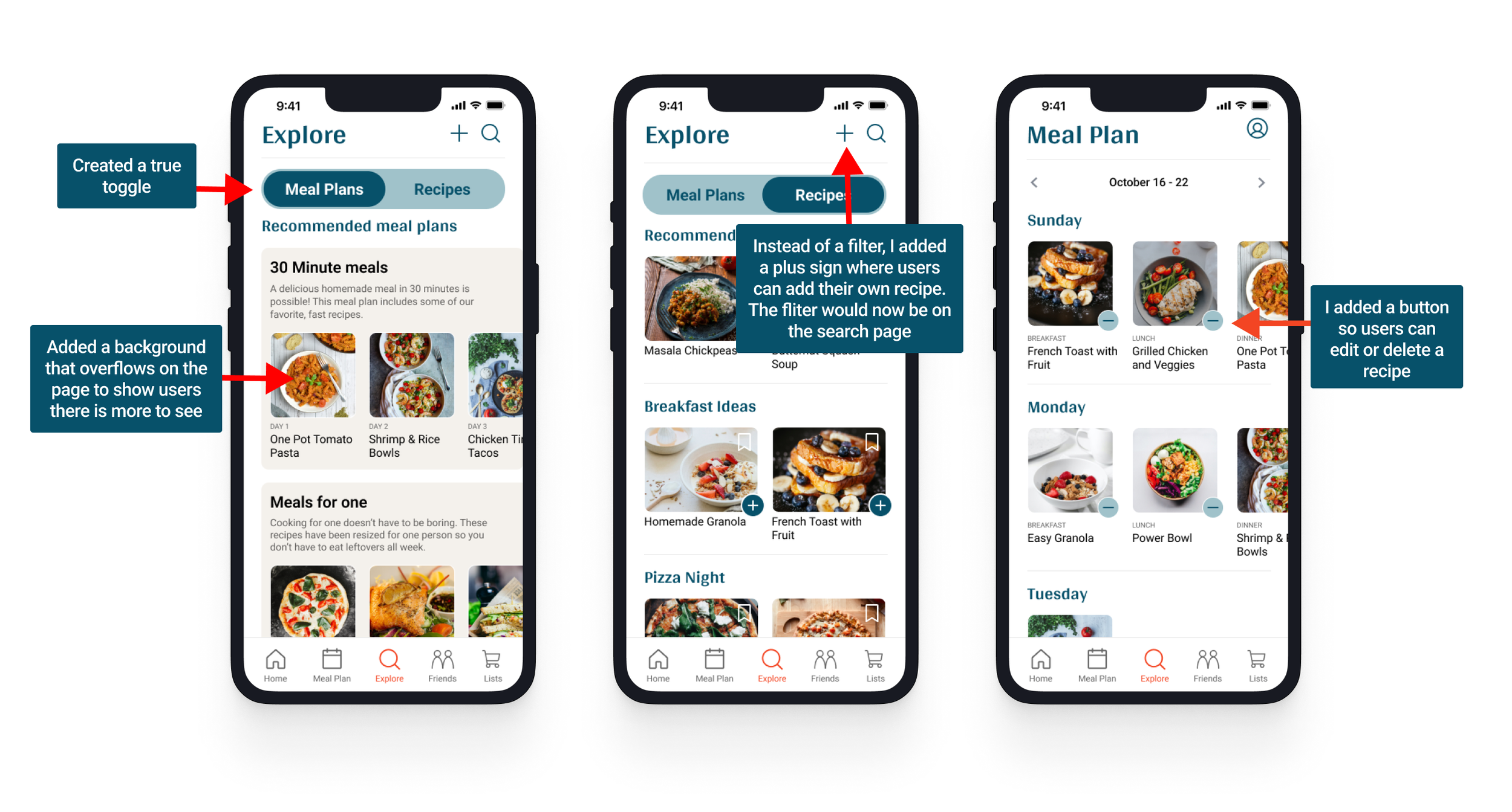 Next Steps: In addition to the pre-set meal plans, I think one of the best features of this product is the social aspect that allows you to see what your friends are making, and with more time I’d love to build out that feature and conduct more research around how users would want to interact with others in the app.