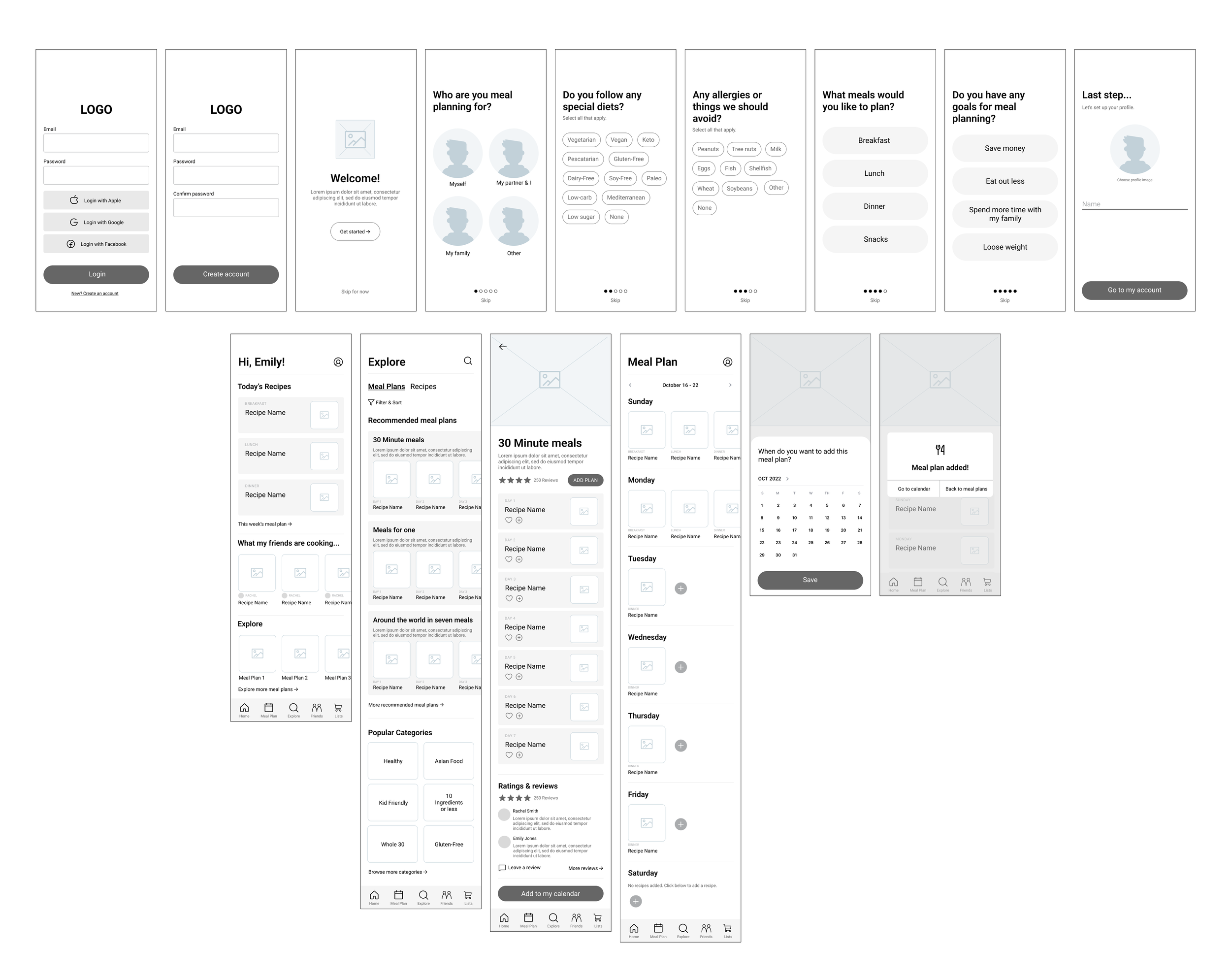 When creating the sitemap I prioritized the main functions of the product and created the categories of meal plans, explore, friends and shopping list which would be a part of the bottom navigation of the app and allow quick access. I also added a homepage which would share quick summaries of these categories and provide easy access to the user’s profile.